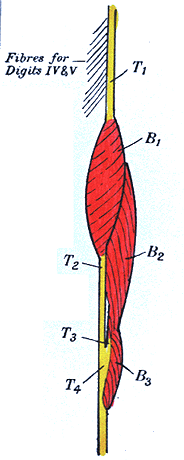- Macalister (1868) described a case where the radial head and part of the condyloid went to the middle finger, a tendon from the muscle, a few inches below the condyle, becoming fleshy, supplied the ring finger, and the remainder supplied the index and little fingers;